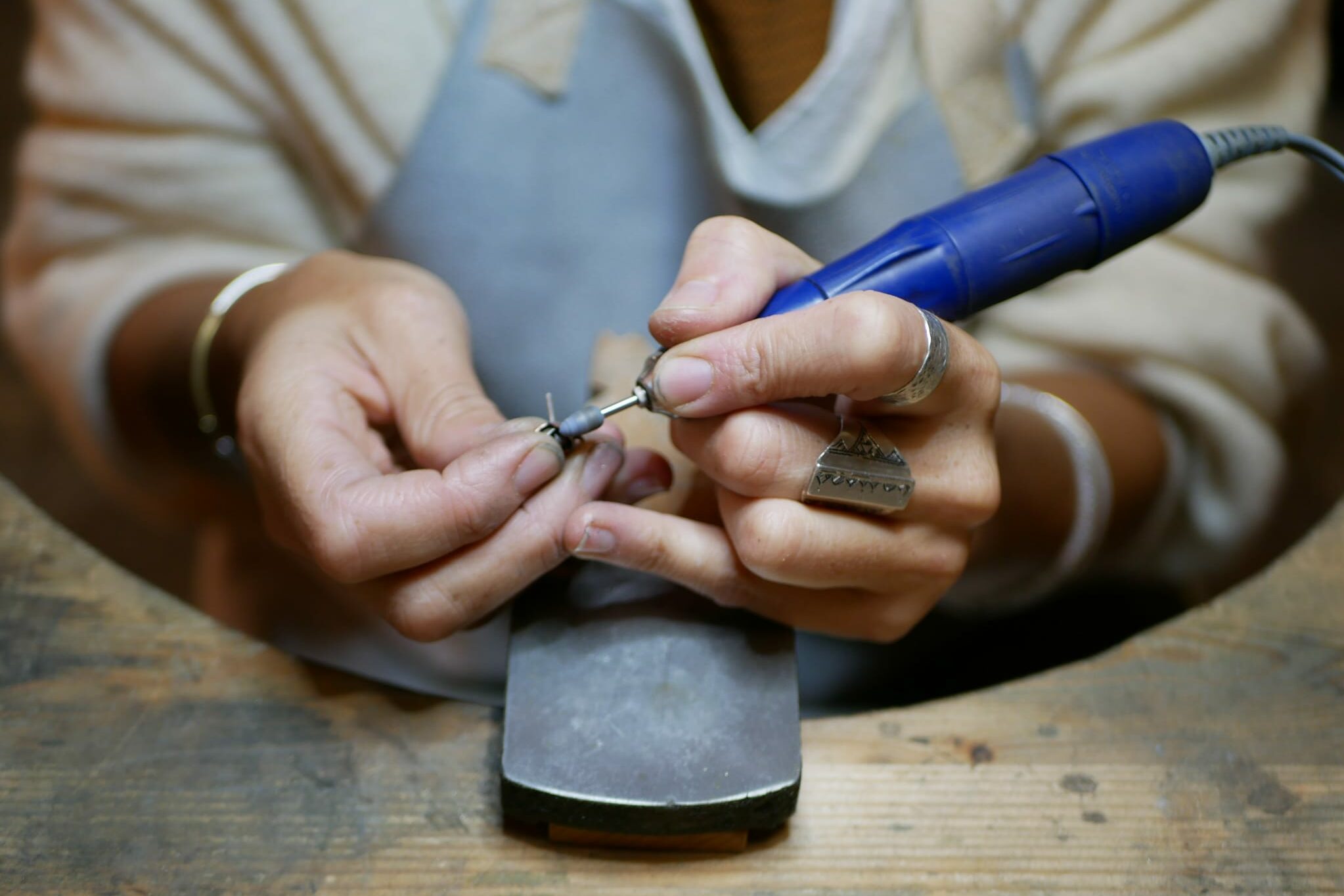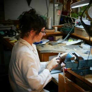 Je crée des bijoux depuis 2007. En 2019, après un long cheminement artistique et personnel, j’ai choisi d’orienter pleinement mon travail vers la transformation des métaux « à la cheville ». Ce tournant marque une étape décisive dans mon parcours d’orfèvre artisane : le passage d’une approche centrée sur la composition à une recherche approfondie de la matière et du geste.