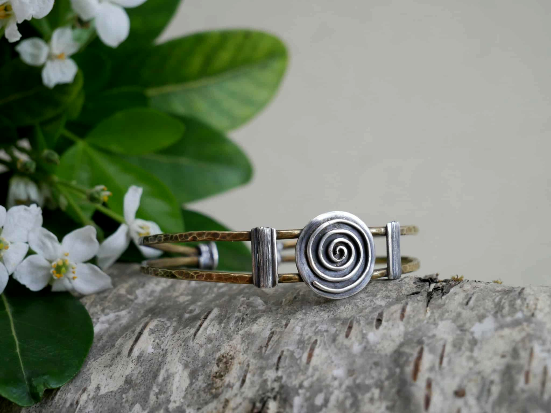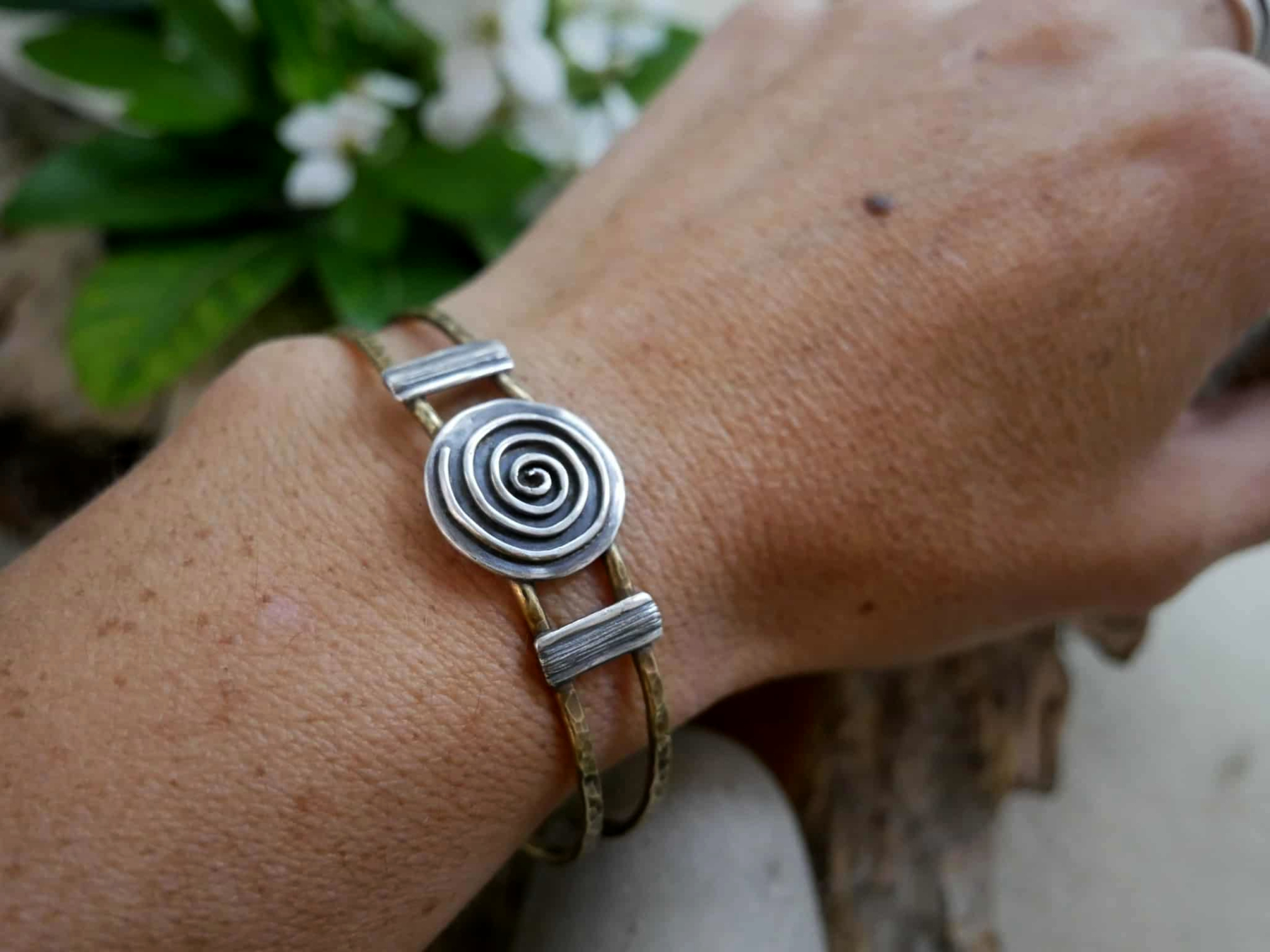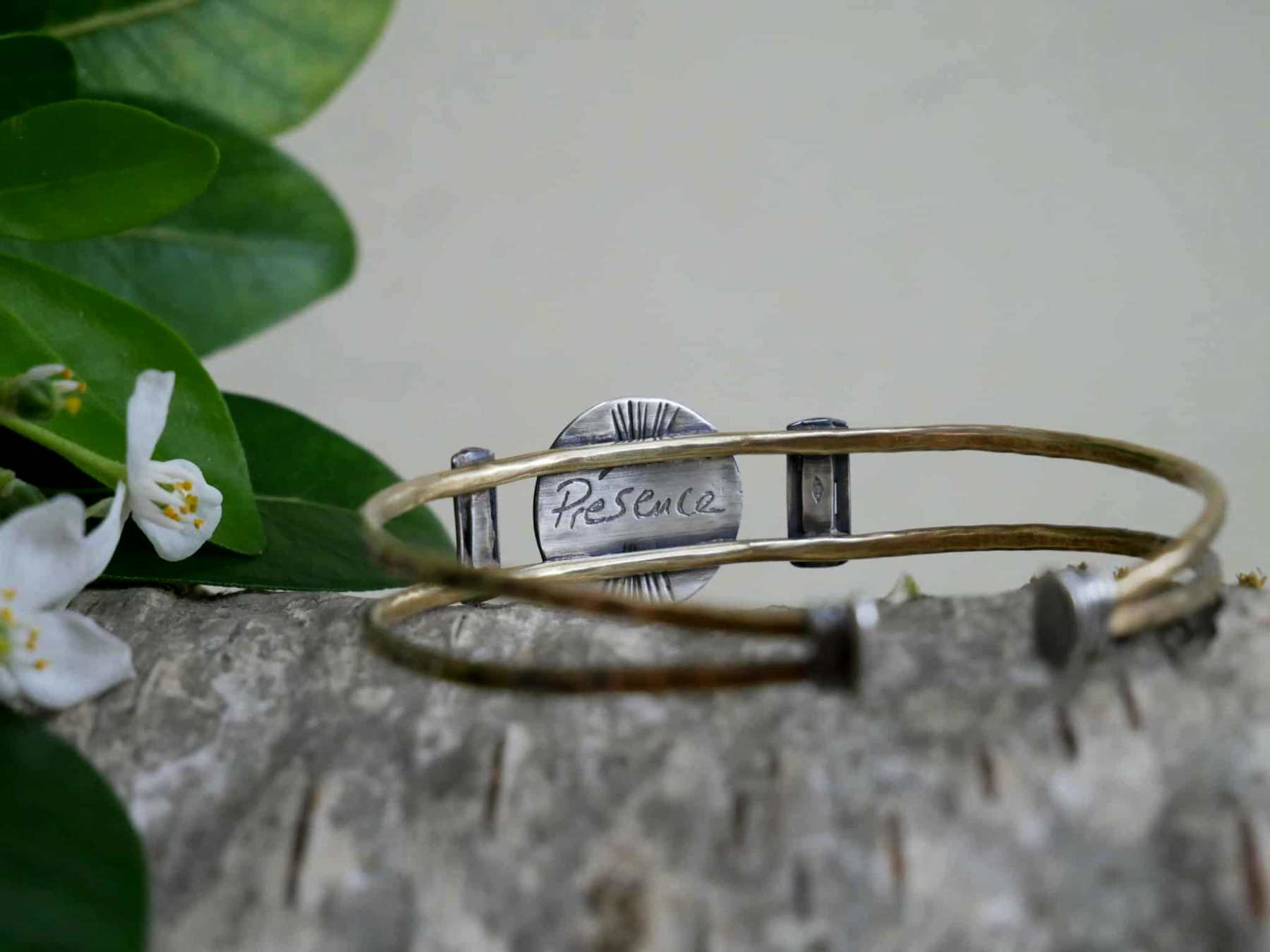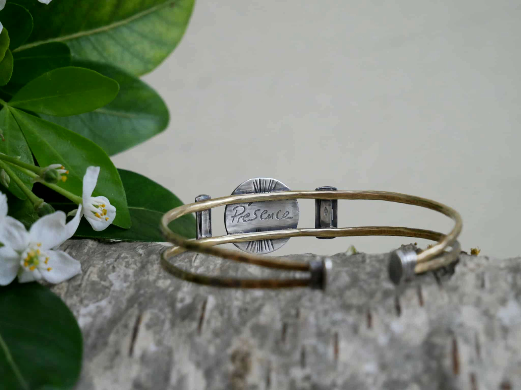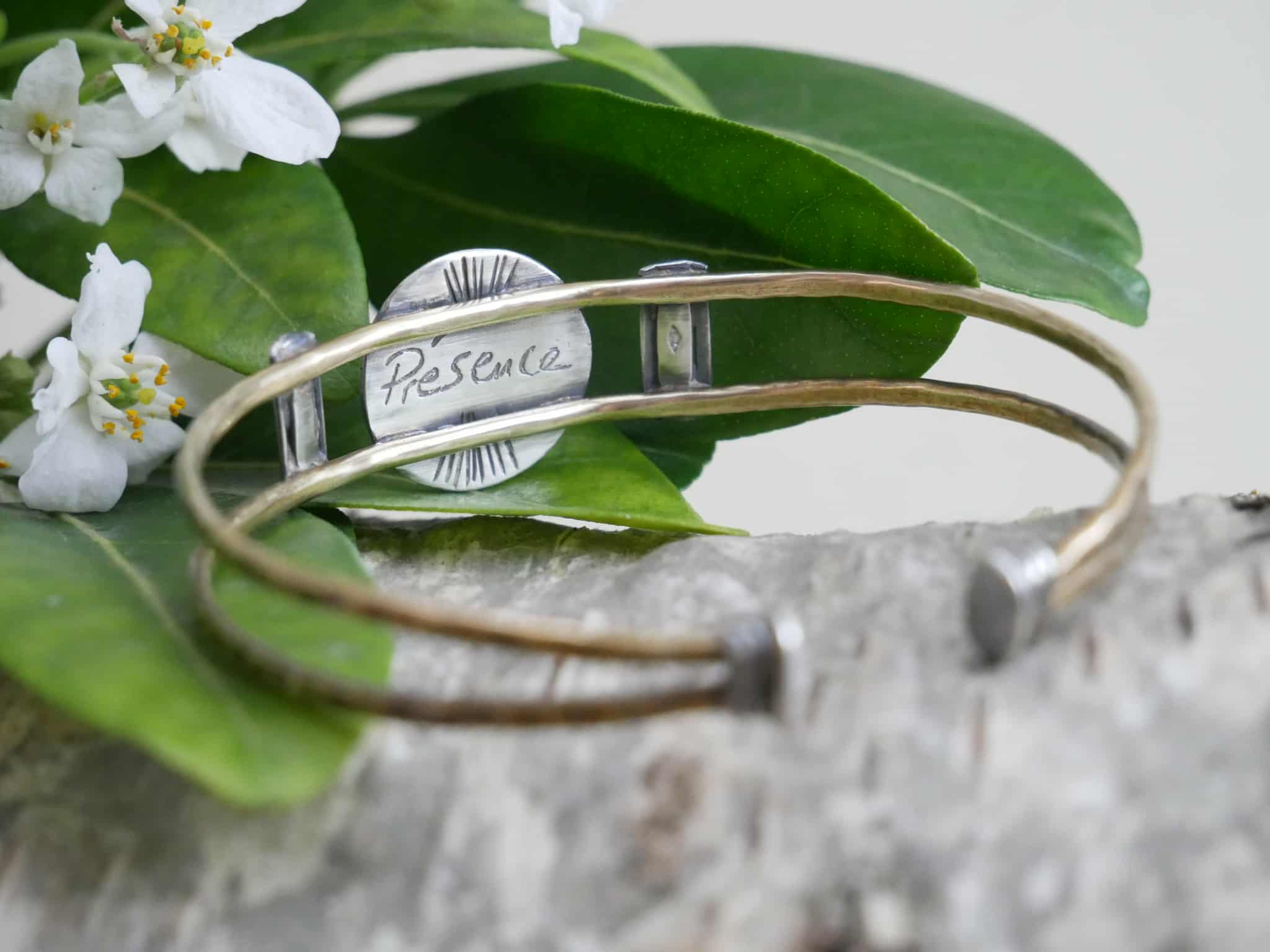 Ce bracelet jonc mixte en argent et laiton est une pièce unique, mariant élégance et symbolique. Sa spirale et l’inscription du mot Présence rappelle le flux permanent de la Vie et appelle à revenir à la Présence à chaque souffle, pensée, parole, geste…