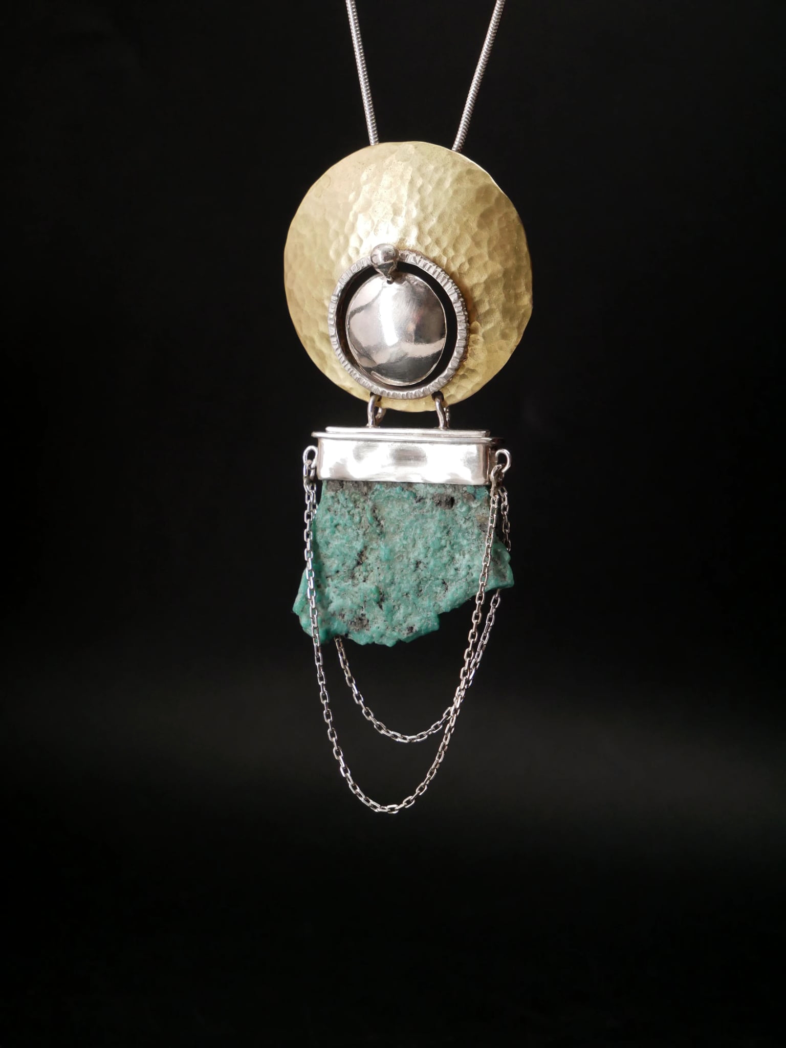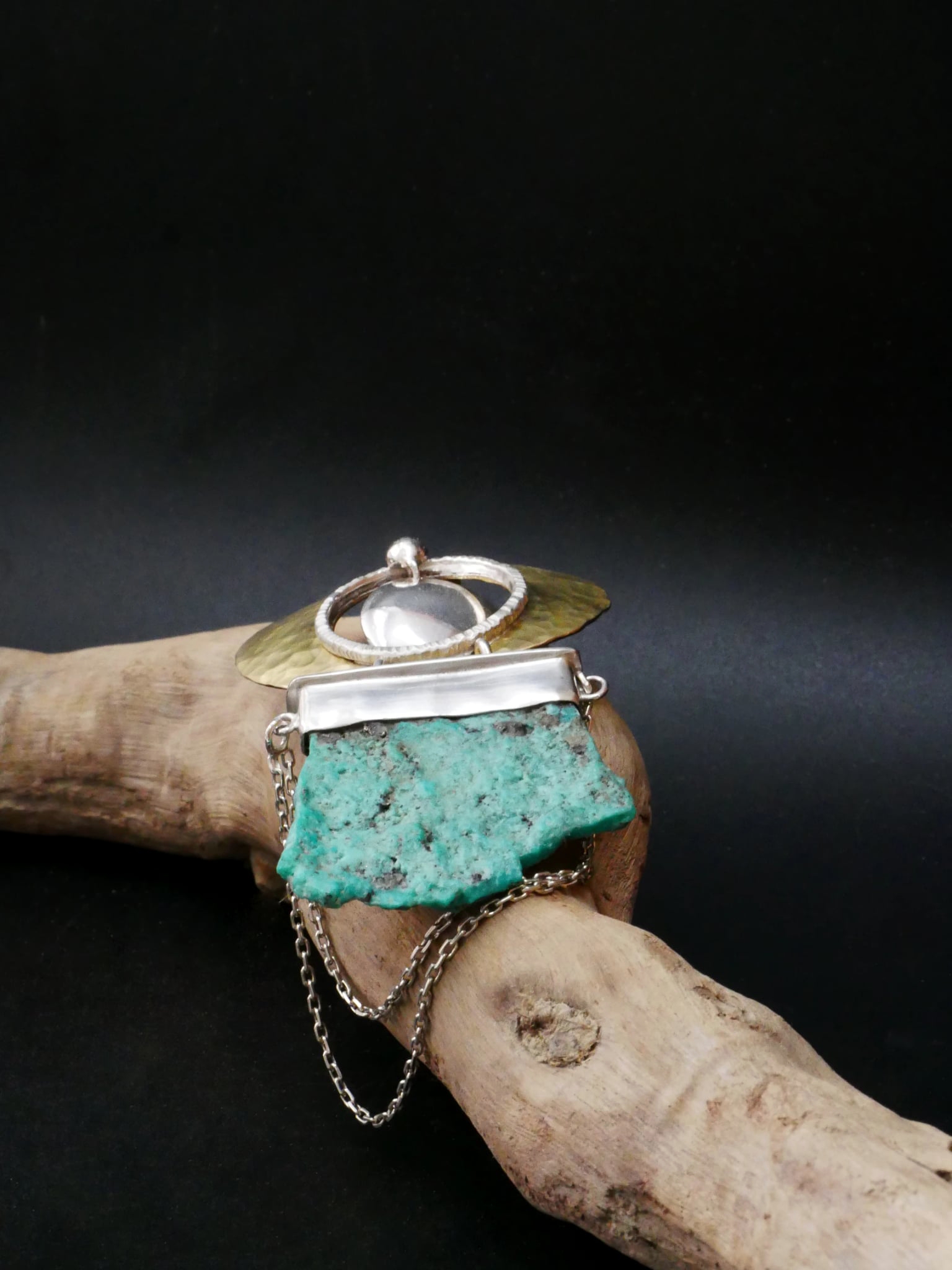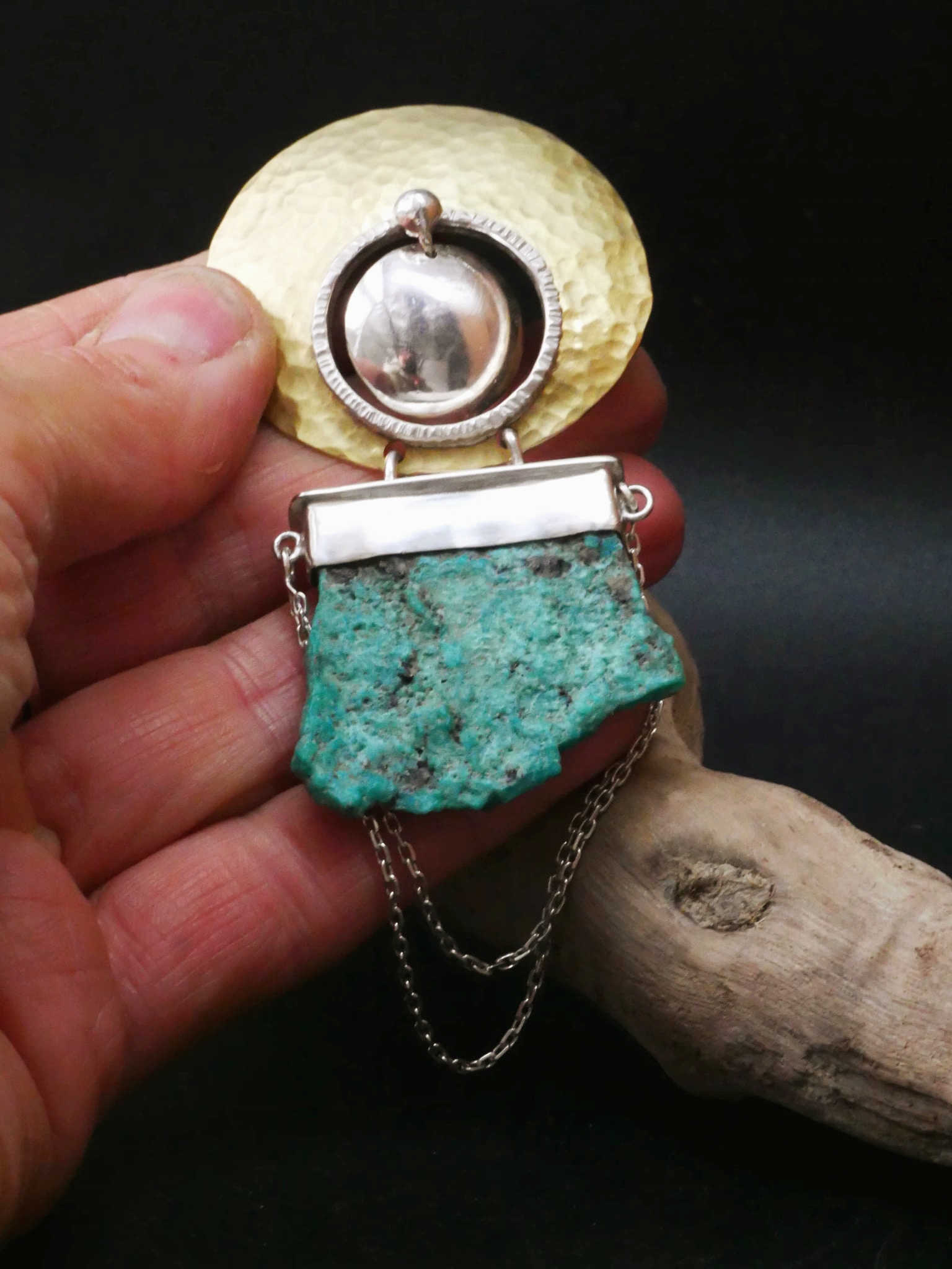Pendentif de créateur en argent et laiton martelé, où la lumière solaire du métal dialogue avec une turquoise brute à la texture minérale.