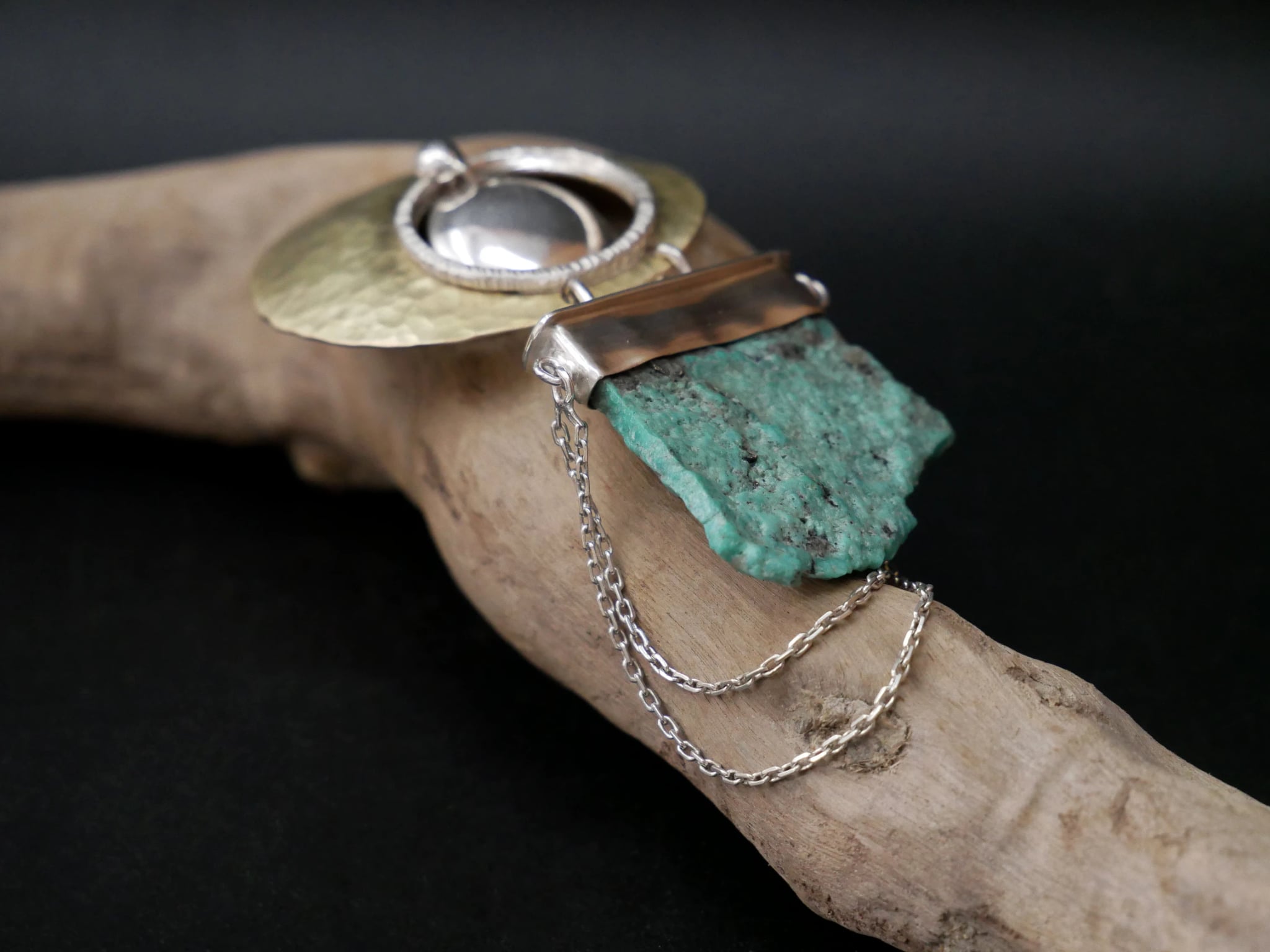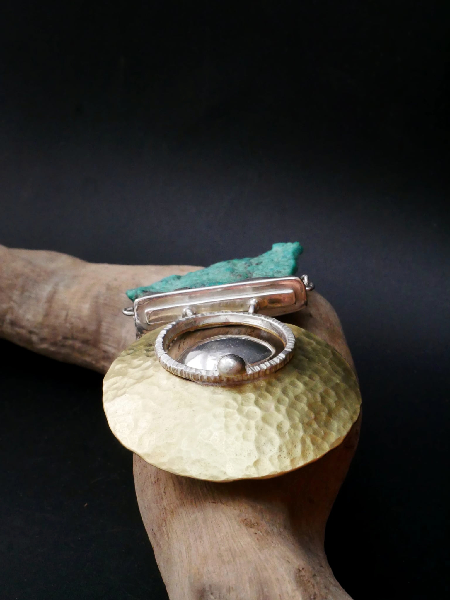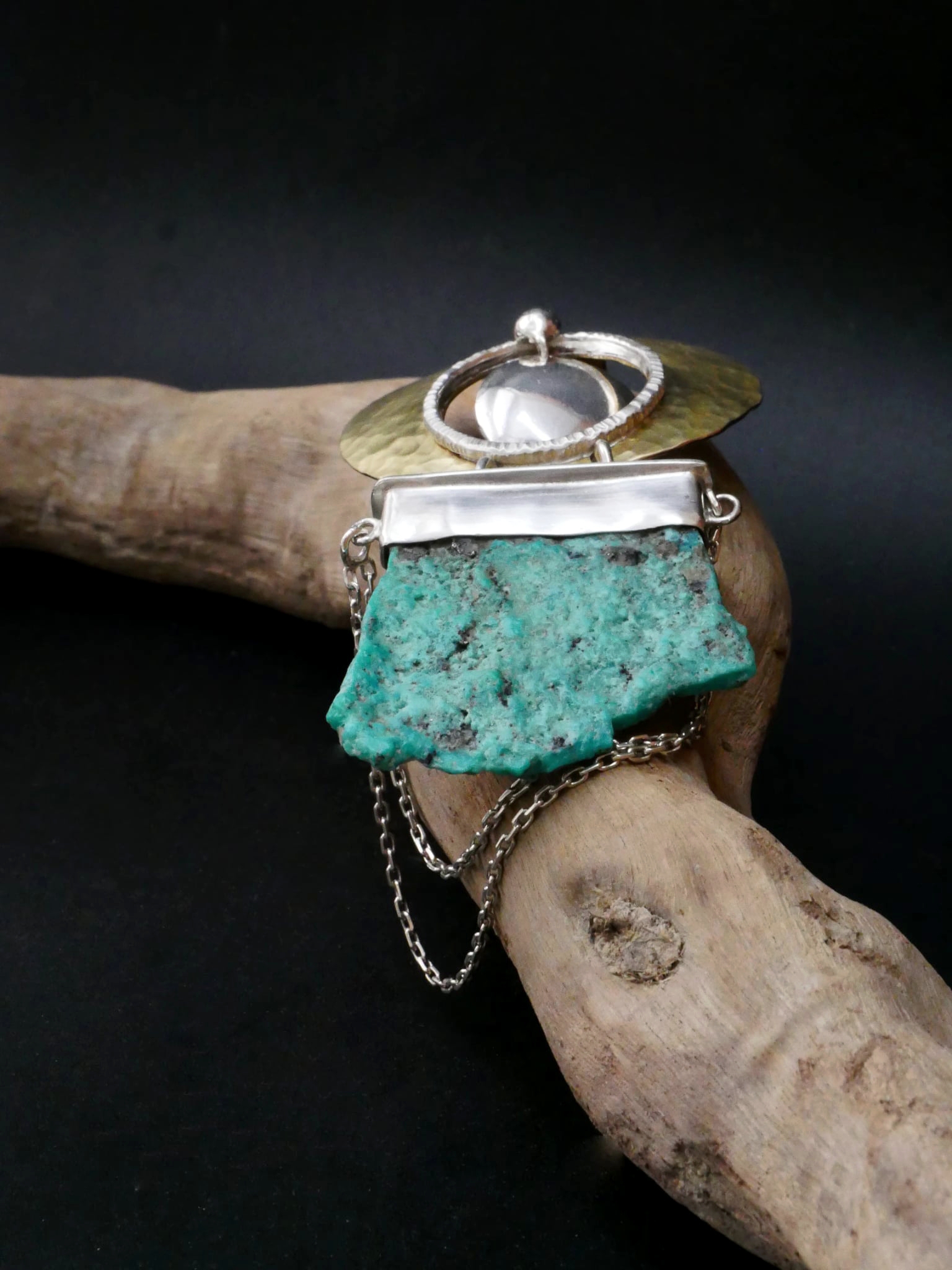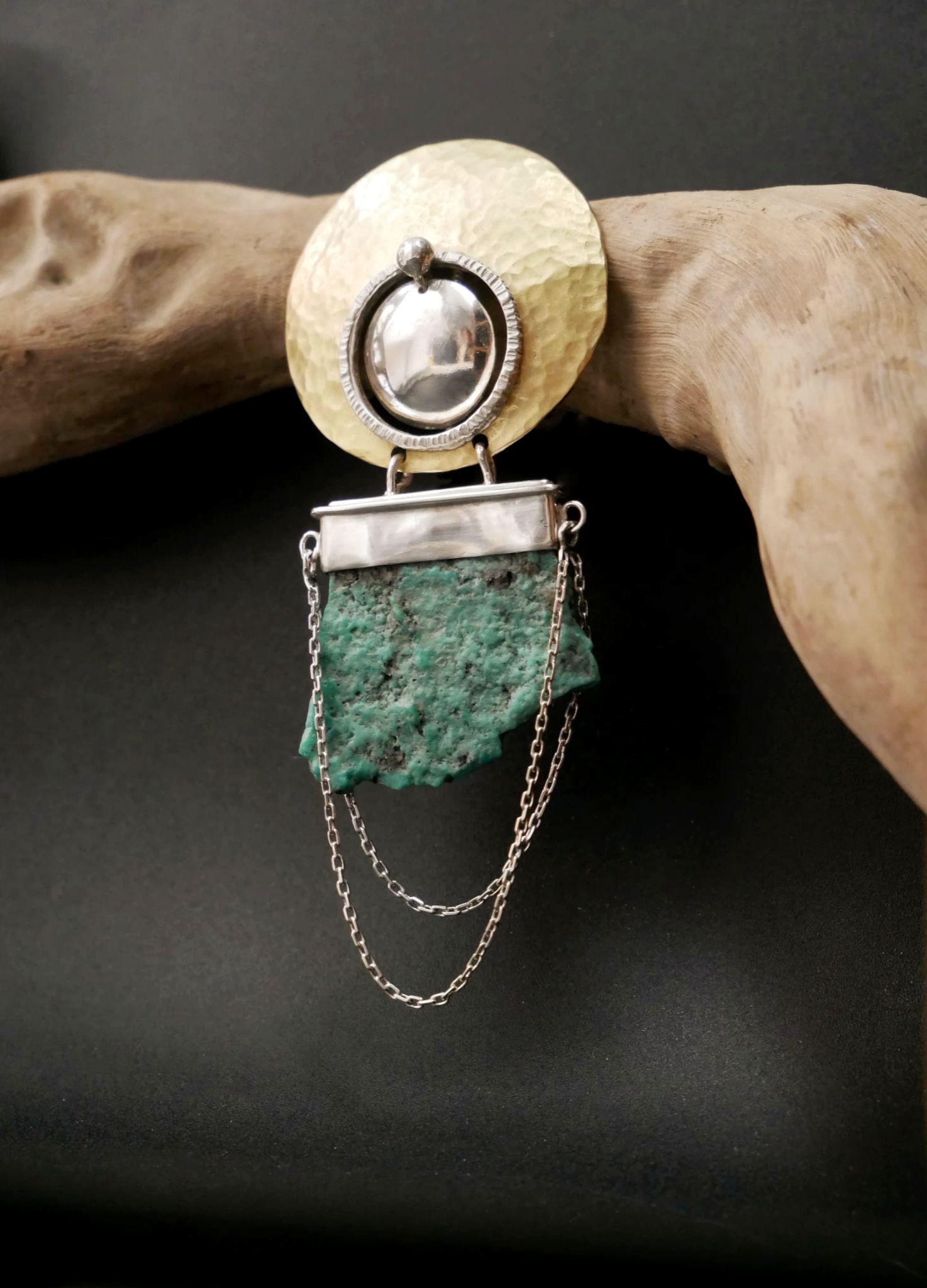 Pendentif de créateur en argent et laiton martelé, où la lumière solaire du métal dialogue avec une turquoise brute à la texture minérale.