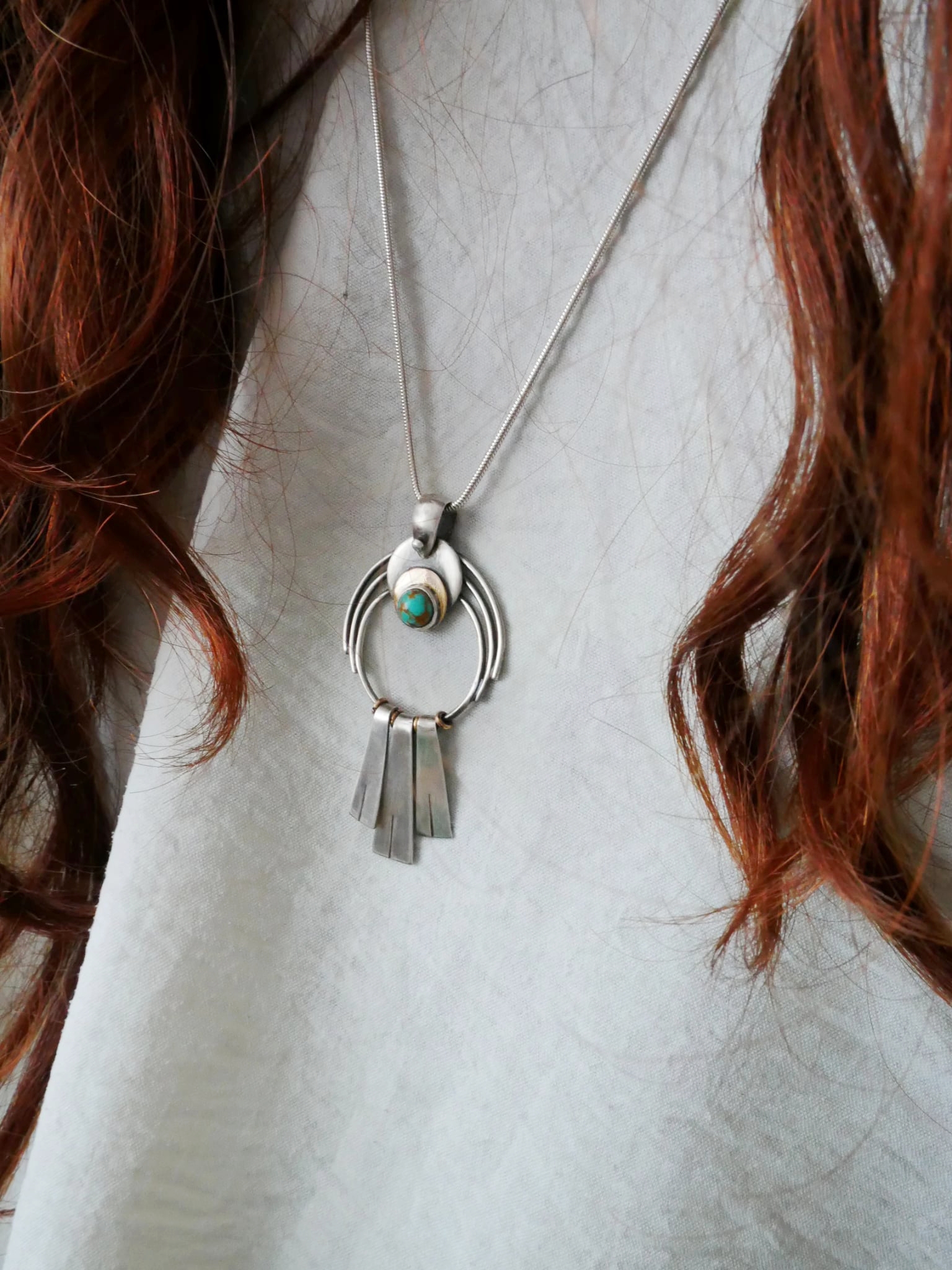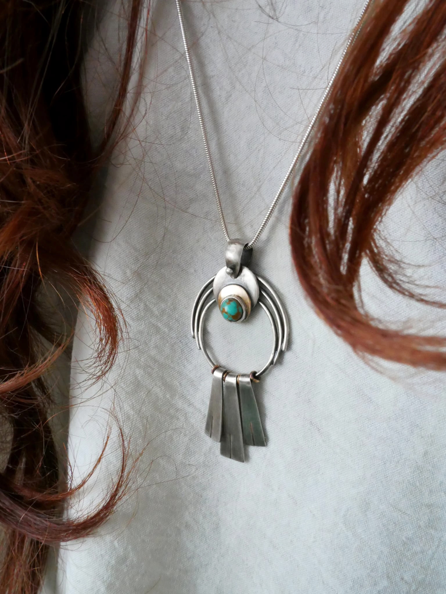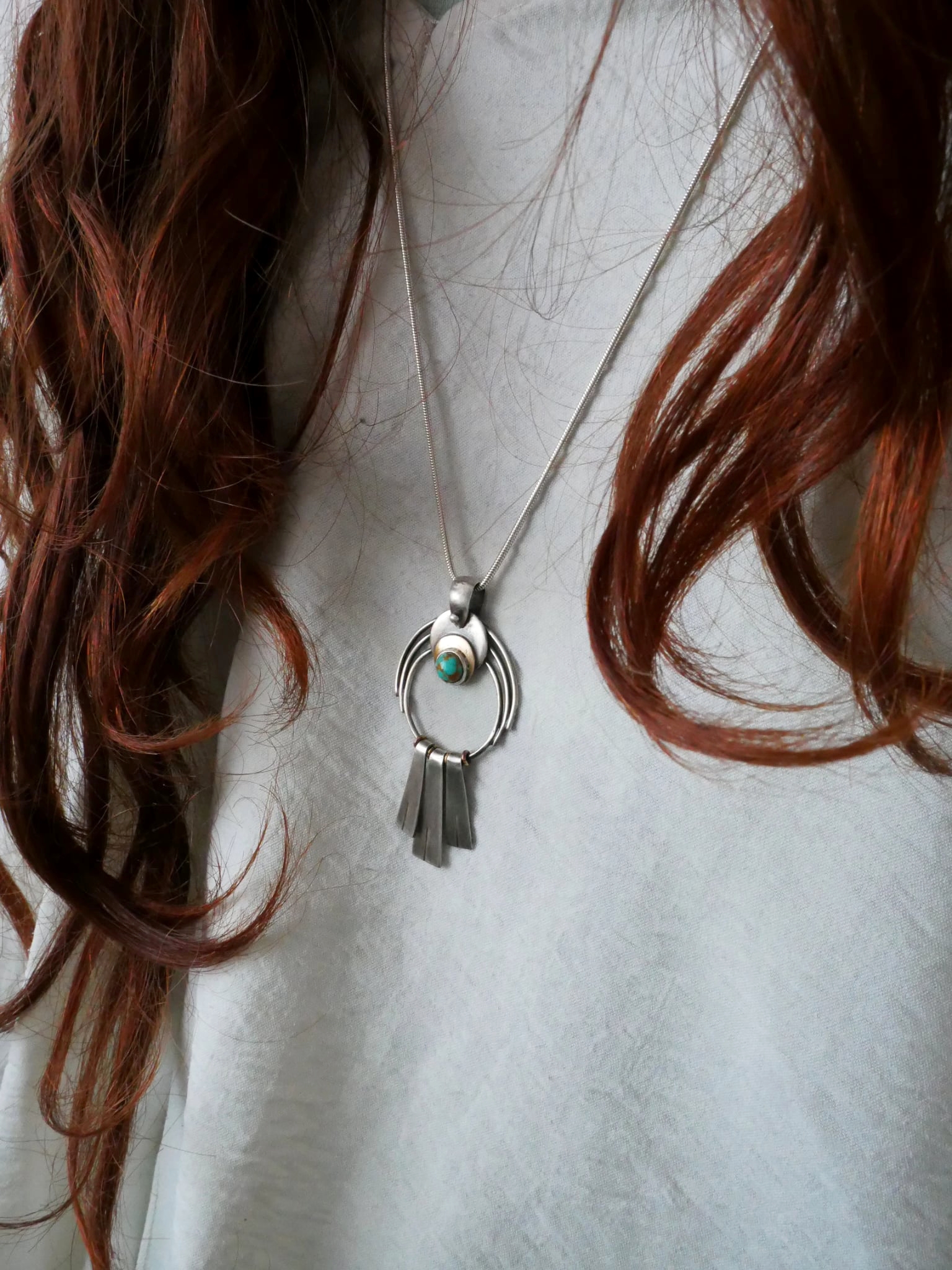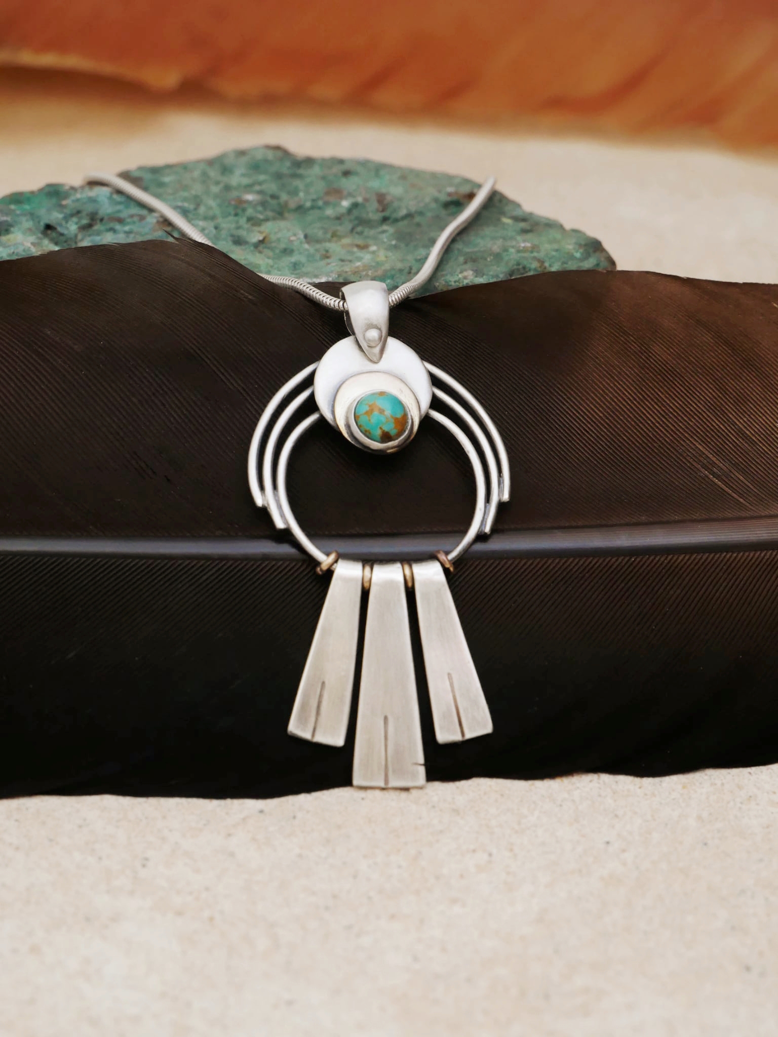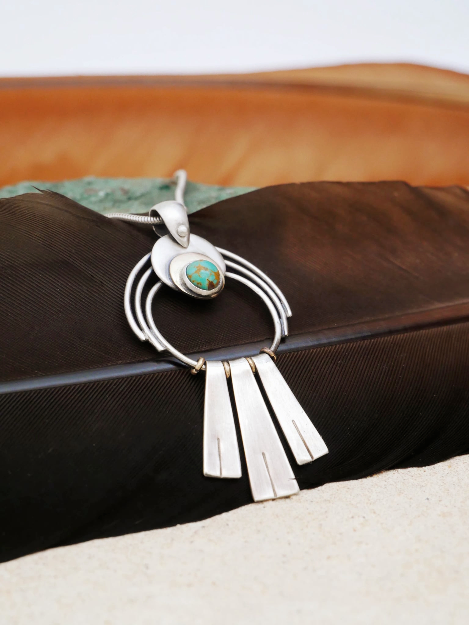 En argent et laiton, un croissant de lune accueille un cabochon de turquoise naturelle veinée — cette pierre qui, depuis toujours, accompagne celles et ceux qui osent se montrer tels qu’ils sont. En dessous, trois franges d’argent brossé s’élancent comme des plumes, comme un souffle, comme une invitation à avancer.