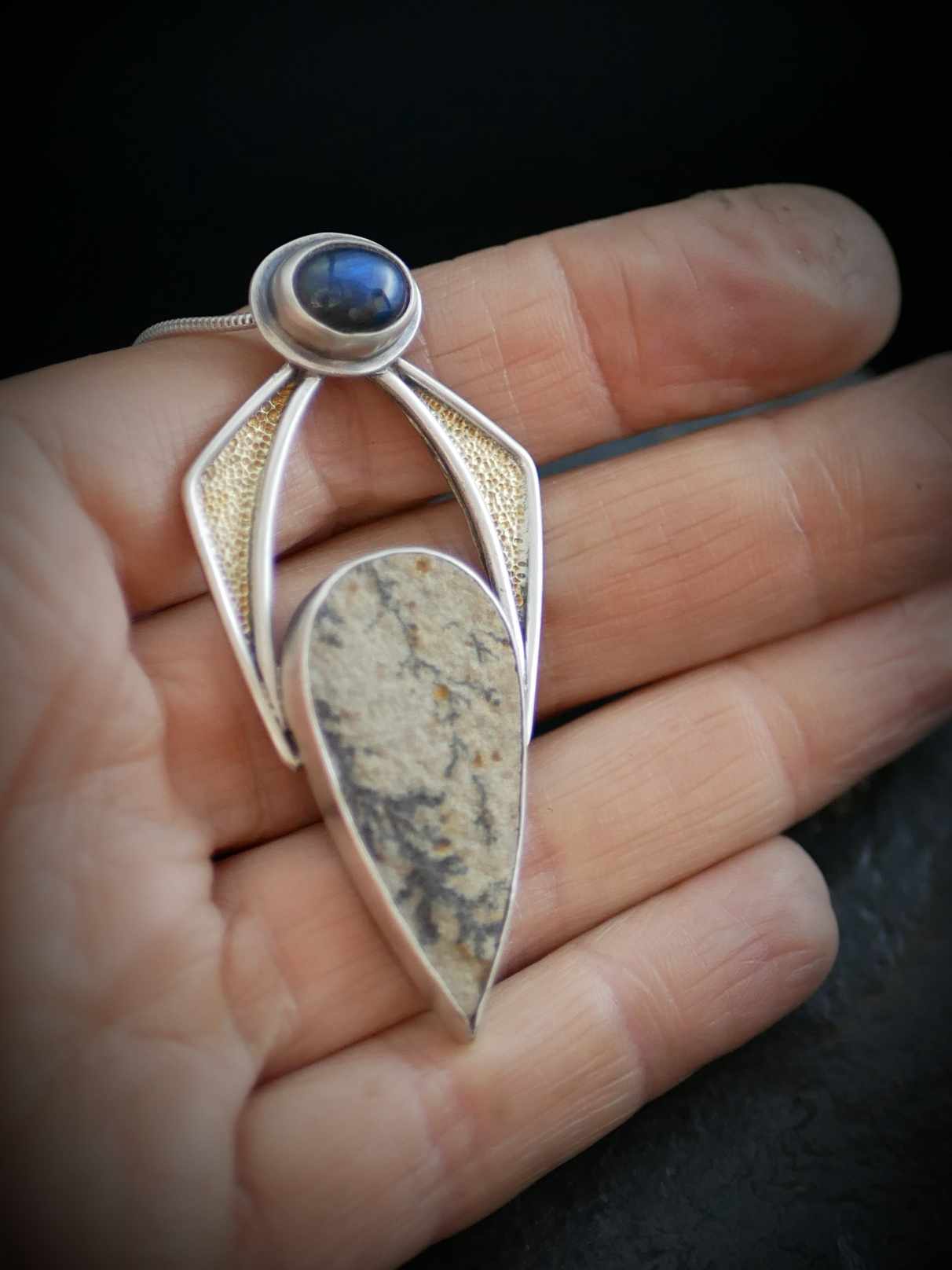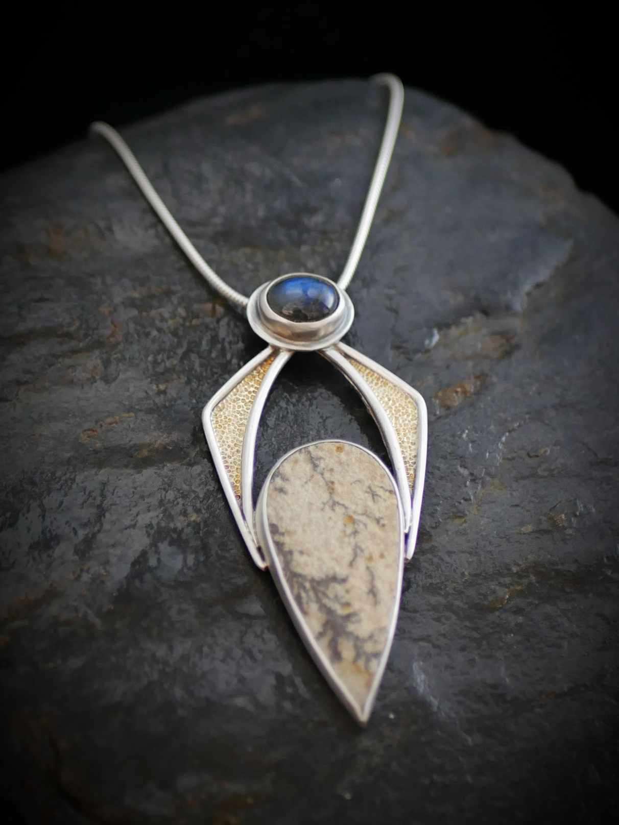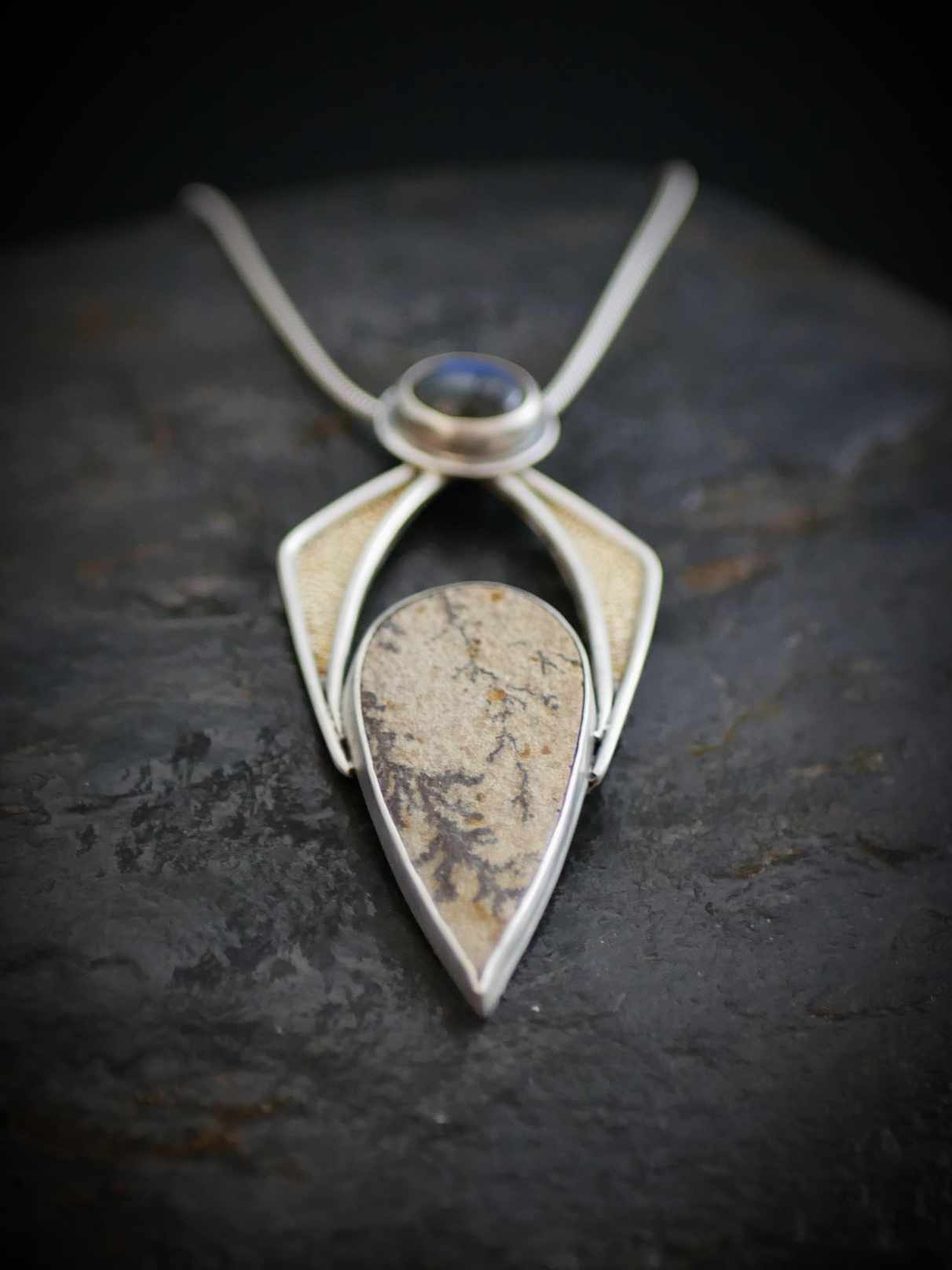 Argent 950, laiton, Psilomélane dendritique et Labradorite