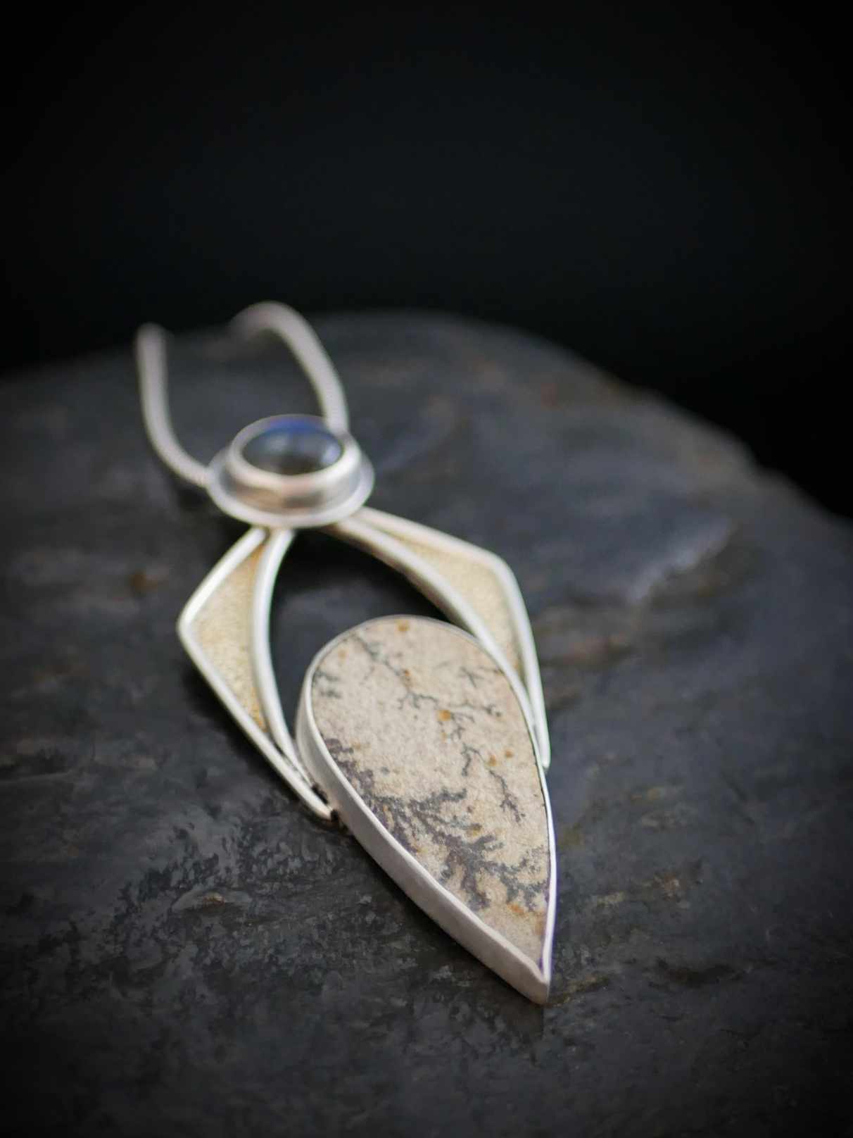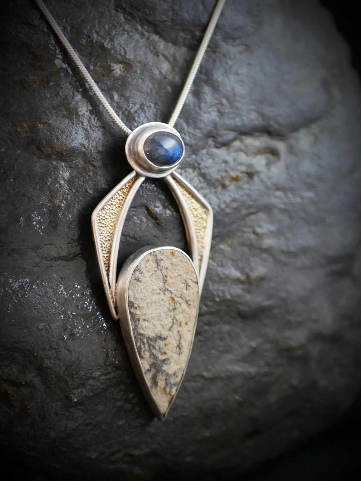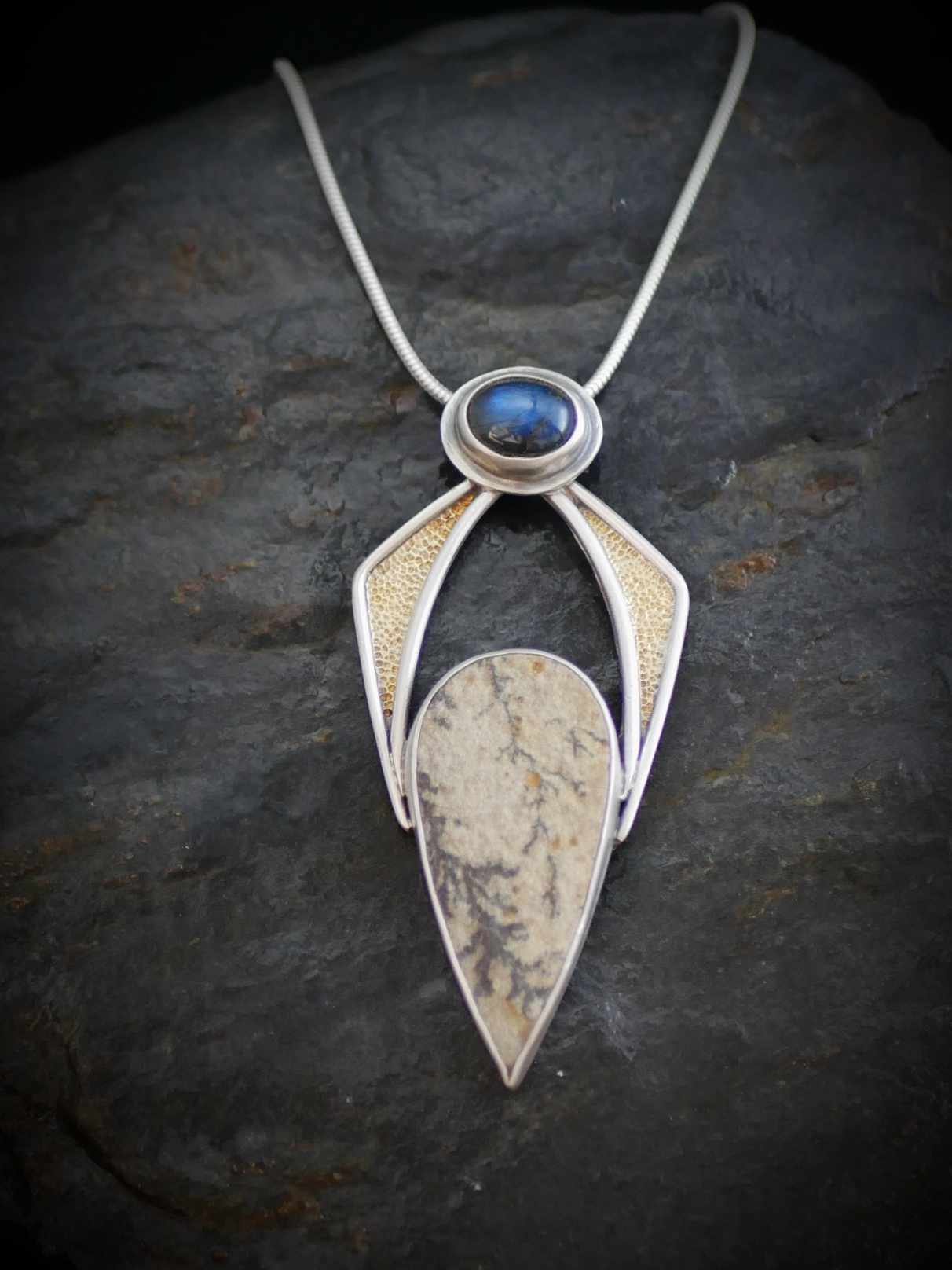 Argent 950, laiton, Psilomélane dendritique et Labradorite
